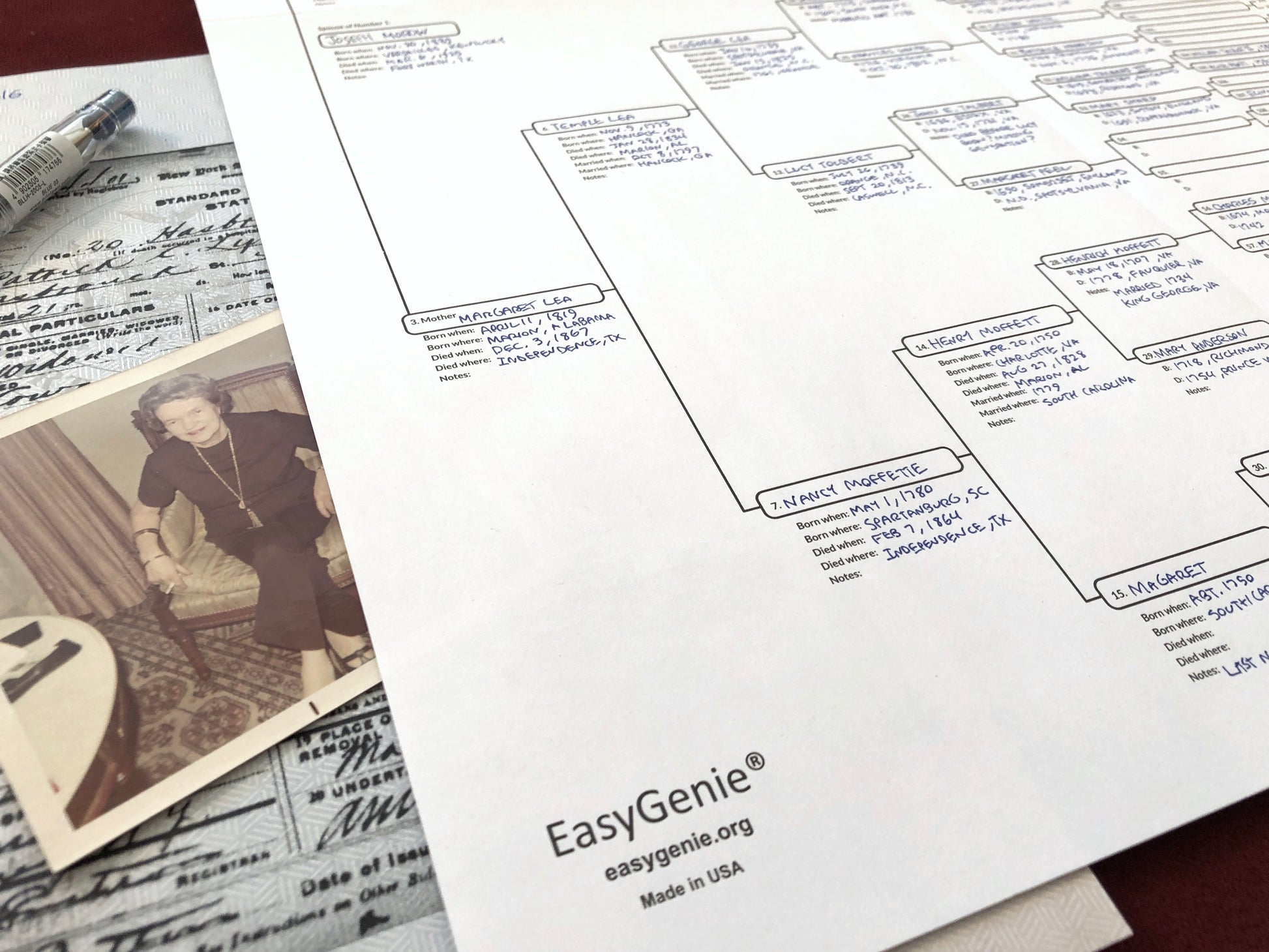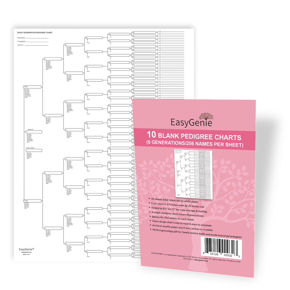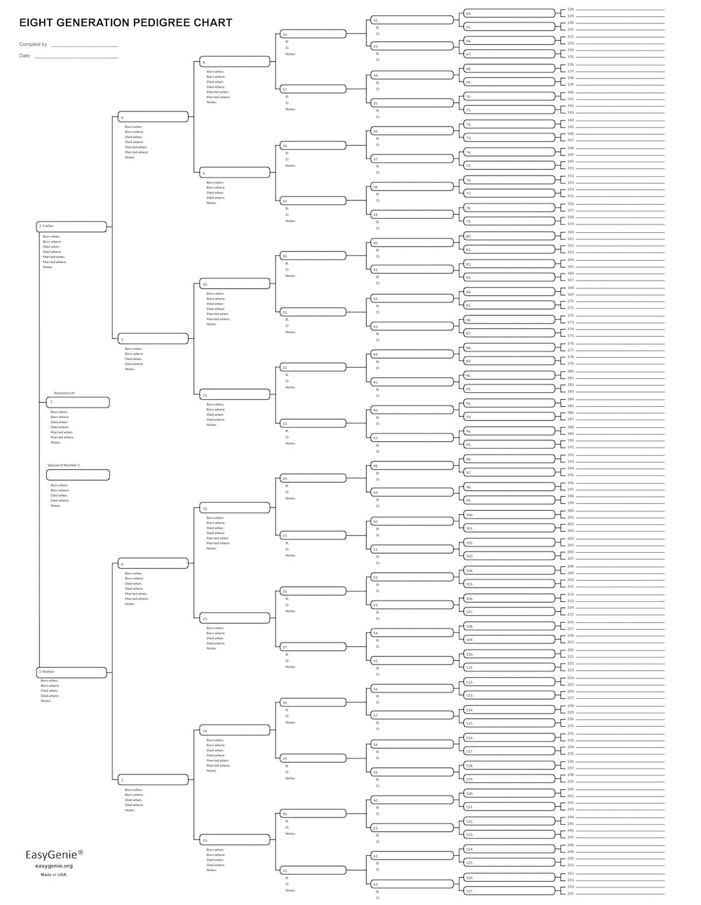 Get 10 Blank Pedigree Charts to organize and present 8 generations of family research! EasyGenie’s custom genealogy forms were designed with ease-of-use and readability in mind, with clear fonts, logical organization, and lots of space to record genealogy data such as names, dates, and other information.
