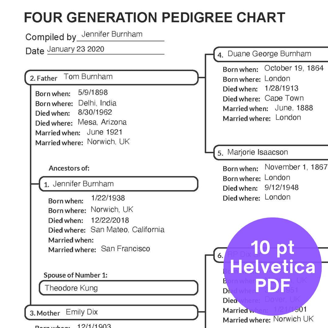 Genealogy PDF: 4 Generation Pedigree Chart (Helvetica, 11 x 8.5 inches)