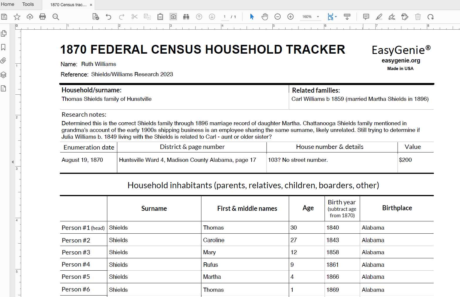 The fillable 1870 Federal Census Household Tracker PDF download by EasyGenie gives genealogists a better way to track household members than hard-to-read scans or incorrect online transcriptions.