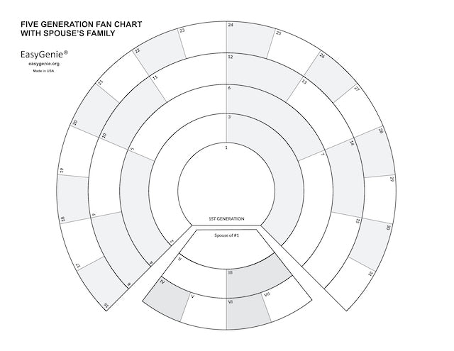 ✅ 10 four-generation pedigree charts, 10 five-generation split fan charts, 10 two-sided family group sheets