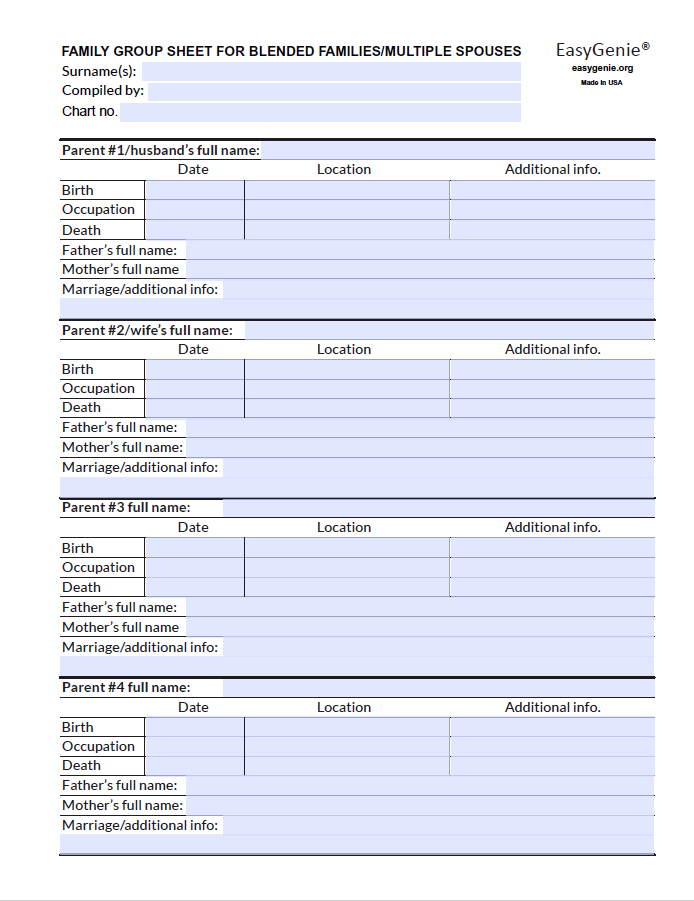 - Family group sheet for blended families/multiple spouses (8.5 x 11 inch, double-sided)